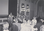 A photographic print of multiple individuals sitting in an auditorium, with one individual speaking through a microphone at a podium.