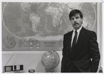 A photographic print of VCU professor Jeffrey Cole standing in front of a world map, a globe, and a device.