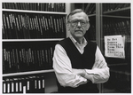 A photographic print of VCU professor Dr. Jan Chlebowski standing in front of a shelf of journals, books, and binders. Chlebowski served as a faculty member at VCU for 39 years, working in the Department of Biochemistry and Molecular Biology, Department of Chemistry, College of Humanities and Sciences, and Biomedical Engineering. He also served as the School of Medicine’s associate dean for graduate education.