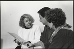 A photographic print of VCU professor Elizabeth Cooper and two other individuals sitting down, with Cooper showing sheets of paper to the individuals.