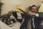 A photographic print of VCU professor Dr. Van Wood displaying a collection of scarfs while displaying their own. Wood was the Philip Morris Endowed Chair of International Business at the Virginia Commonwealth University School of Business.