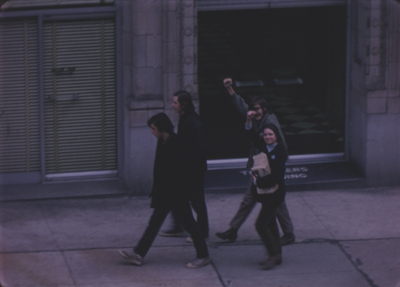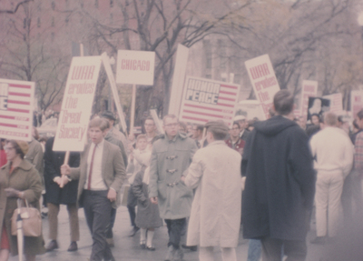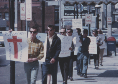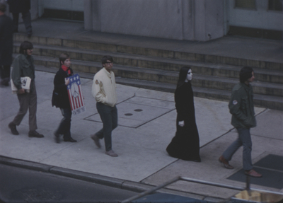 This real contains footage of a protest in opposition to the Vietnam War in front of the Richmond Federal Building in downtown Richmond on April 29, 1967. About 100 individuals participated in the march. Individuals march holding signs or flowers, wearing business clothing. Several children participated in the march as well. This appears to be a group of majority white participants. Towards the middle of the reel, there is footage of a pro-war counterprotest of approximately seven individuals, all of whom appear to be white.