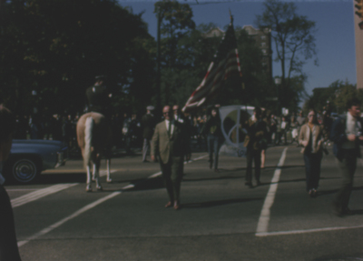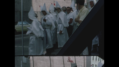 This reel contains footage of individuals wearing Ku Klux Klan robes and hoods (with their faces showing) marching on Broad Street and at the Virginia State Capitol grounds. The footage is undated, however it appears that this occurred on July 8, 1967. Some group members appear in both reels of the event. This appears to be a group of majority white participants. The final clips of the footage appear to be from the March on the Pentagon on October 21, 1967.