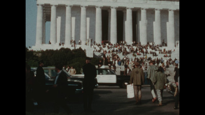 This reel contains footage filmed at the Lincoln Memorial in Washington, D.C. on October 21, 1967, of a demonstration against the Vietnam War. Footage of the crowd on the steps of the Lincoln Memorial and around the Reflecting Pool. This appears to be a group of majority white participants.