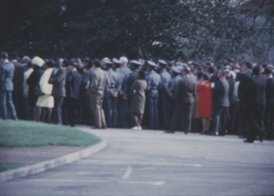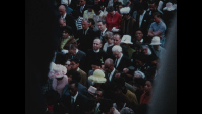 This reel contains footage of a gathering at the Virginia State Capitol on April 7, 1968, in mourning of the assassination of Dr. Martin Luther King, Jr. on April 4. The majority of individuals wear dress clothes/church clothes. This appears to be a group of racially diverse participants.