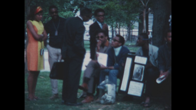 This reel contains footage filmed in Monroe Park on May 5, 1968, during a protest in support of Elliott Hatcher. Footage of the crowd at the park as well as one speaker is featured. This appears to be a group of majority Black participants.