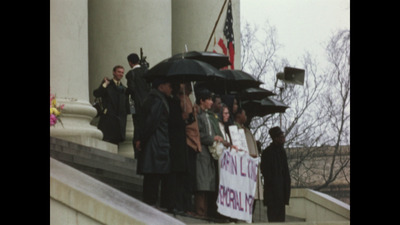 This reel contains footage of some 500 individuals gathering on the steps of the Virginia State Capitol in support of voting rights legislation. Towards the end of the footage, they appear to pray and sing. An object covers the top right corner of the frame throughout most of the footage. This appears to be a group of racially diverse participants.