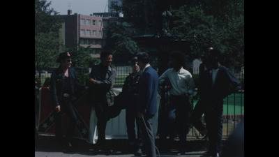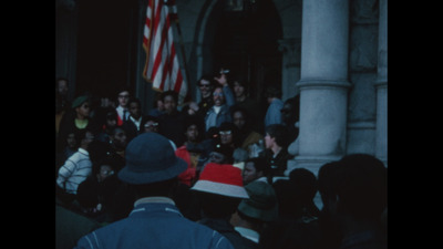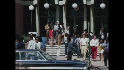 This reel contains footage filmed outside of the Richmond City Courthouse (known as the United States Post Office and Customhouse) from Jamil Al-Amin's (H. Rap Brown) habeas corpus hearing on September 16, 1967. This appears to be a group of racially diverse participants.