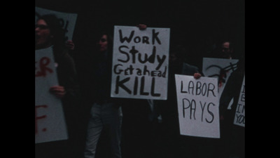 This reel contains footage of a student picket in front of the Richmond Professional Institute (RPI) administration building which took place on October 20, 1965 between 8AM and 9:15AM. Several dozen students picketed with signs supporting three RPI students who had been denied enrollment due to having long hair and beards. This appears to be a group of majority white participants.