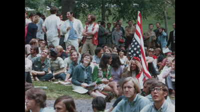 This reel contains footage filmed at the Lincoln Memorial in Washington, D.C. on October 21, 1967, of a demonstration against the Vietnam War. Footage of the crowd near the Lincoln Memorial and around the Reflecting Pool. It also contains footage of a counter-protest and of speakers at a podium. This appears to be a group of majority white participants. -